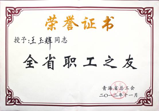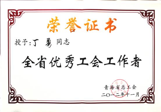 在2012年11月23日召開的青海省工會第13次代表大會上,省總工會對全省優(yōu)秀個人、模范集體進(jìn)行了表彰。集團(tuán)總經(jīng)理王玉輝同志榮獲"全省職工之友"榮譽(yù)稱號;青海物產(chǎn)物資配送有限責(zé)任公司工會榮獲"全省模范職工之家"榮譽(yù)稱號;馬軍同志榮獲"全省優(yōu)秀工會積極分子"榮譽(yù)稱號;丁勇同志榮獲"全省優(yōu)秀工會工作者"榮譽(yù)稱號。