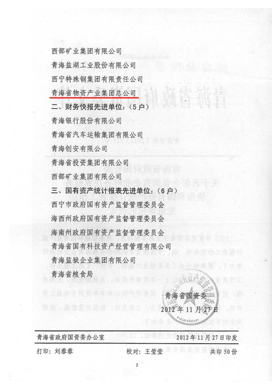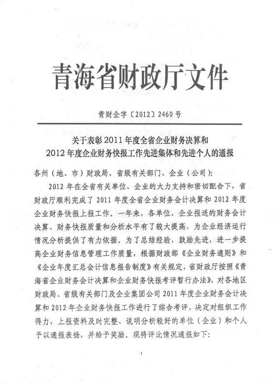 2012年,在集團及所屬各公司領(lǐng)導的高度重視下,在所屬各公司的大力支持和密切配合下,在辛勤工作在財務(wù)會計崗位上的同事們的共同努力下,集團總公司圓滿完成了省國資委和省財政廳各類報表的上報工作,財務(wù)信息工作質(zhì)量、時效性和財務(wù)分析水平都比上一年度有所提高,受到了省國資委和省財政廳的好評,集團總公司2011年度財務(wù)決算工作被省國資委評為先進單位,集團財務(wù)審計部張莉青同志被省財政廳評為2012年度財務(wù)快報工作先進個人。